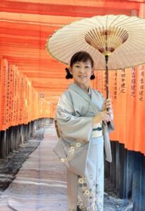 茶道は高校時代に裏千家で学び始め、カナダ移住後も研鑽を重ね、2012年より裏千家名誉教授新宗楓氏に師事、上級許状取得。現在はテーブルスタイル茶道講師として指導。身近な道具で楽しめる茶道を通し、「今ここ」を大切に生きるセルフケアとウェルビーイングの実践を国内外で紹介している。